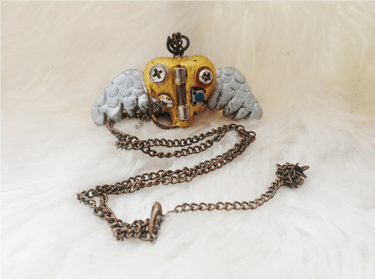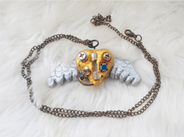 Collar con dije de un corazón alado metálico de aspecto oxidado. Inspirado en la estética del steampunk. Realizado en masa flexible.