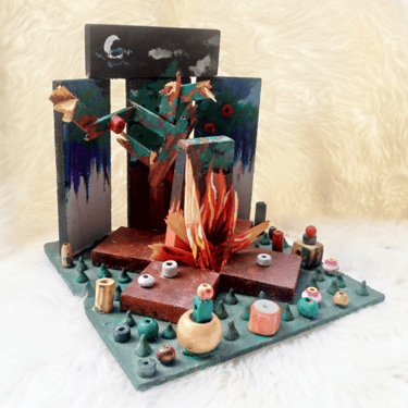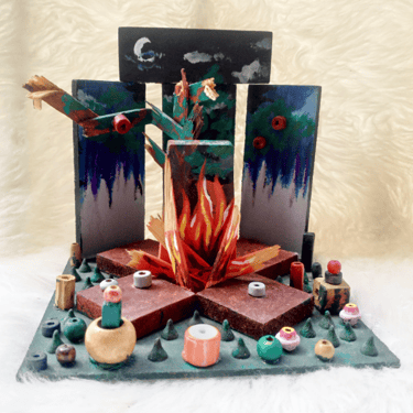 interpretación de un bosque, utilizando piezas recicladas exclusivamente de madera. Se buscó un concepto entre lo abstracto y figurativo, donde se puede apreciar una fogata, un árbol, cielo y vegetación.