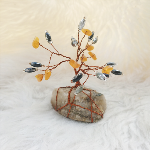 Pieza de alambrismo que representa un árbol sobre un cuarzo natural.