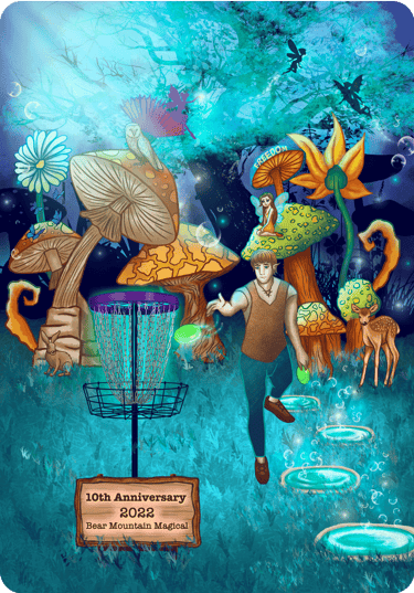 Ilustración Digital para celebrar el décimo aniversario del parque de Disk Golf, Bear Mountain en Bailey, Colorado, USA.