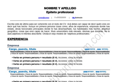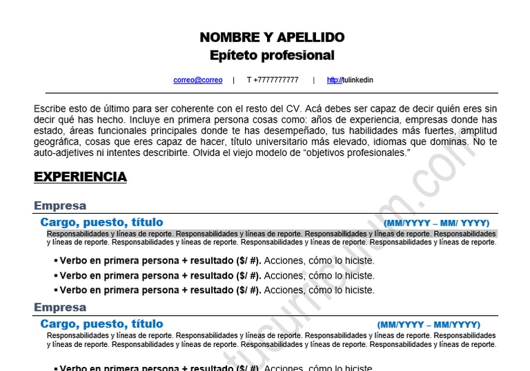 Organiza tu experiencia laboral, de la más reciente a la más antigua y sigue la misma estructura para explicar cada una.